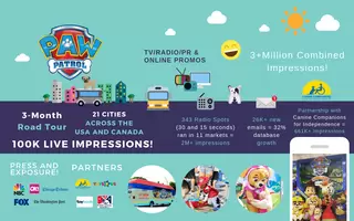 The team was charged with allocating a media buy across all media, including advertising and public relations throughout the three-month tour. In each PAW Patrol Tour market, we aligned with top mom-targeted radio stations to run 343 ad spots in 11 markets, generating over two million impressions.